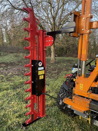 Bei diesem stabilen Heckenmesser, aus Hardox-Material, erfolgt der Anbau über einen Auslegerarm, alternativ kann das Gerät am Bagger, Front- oder Radlader oder an ähnliche Fahrzeuge ang0ebaut werden. Das Schneidwerk wird über die Schlepperhydraulik oder über eine separate Hydraulikanlage angetrieben.
